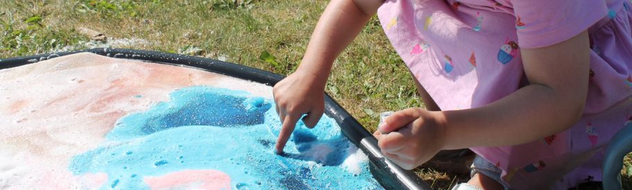 Add a tuff tray sponge to your tuff tray or rectangular tray and add soap and any food colouring. Children can then get involved by standing on the foam mat or squishing it with their hands to create a gloriously foamy mess! This is perfect for those hot summer days to cool your little ones down!