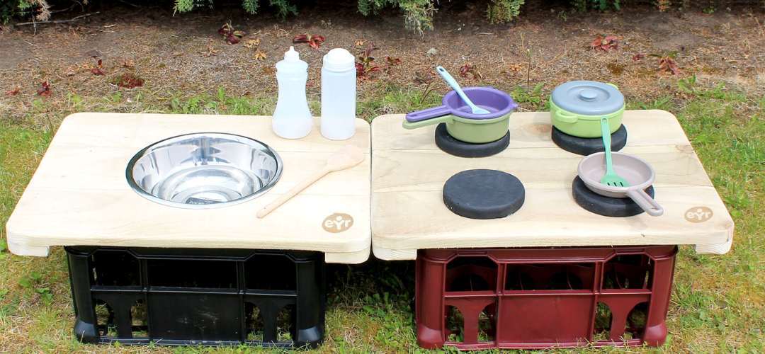 Mud kitchens are a popular outdoor play resource but can be very costly. Create your own affordable kitchen using crates and planks of wood and add in any old kitchen utensils like pans, bowls, spoons, cups etc. Using crates and planks gives you the flexibility to make a larger kitchen to be used by multiple children, or make a singular small kitchen for one child.