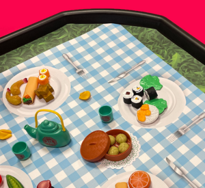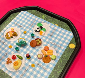 - Set up your tuff tray with our picnic tuff tray mat and arrange the play foods on the different plates and in the centre
