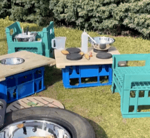 Setting up a mud kitchen can be simple and cost-effective. You could consider a ready built kitchen unit or create more modular upcycled structures using crates and crate toppers, tyres and planks! Below are 4 points to consider when setting up your kitchen.
