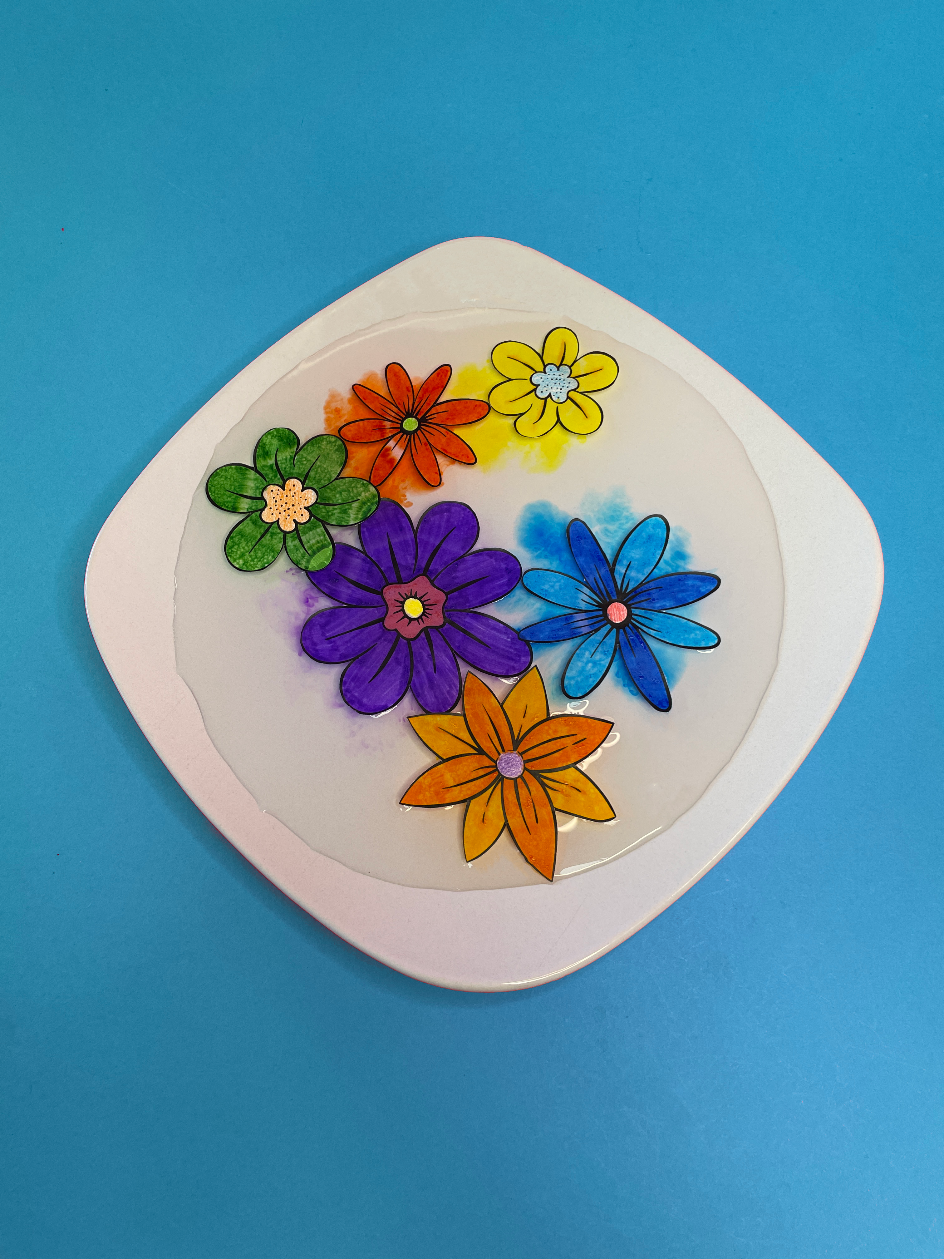- Blooming Flowers: cut out our flowers from the template and colour them in. Then fold in each of the petals over the centre and pop them in a plate of water, watch as the flowers open up and reveal themselves!